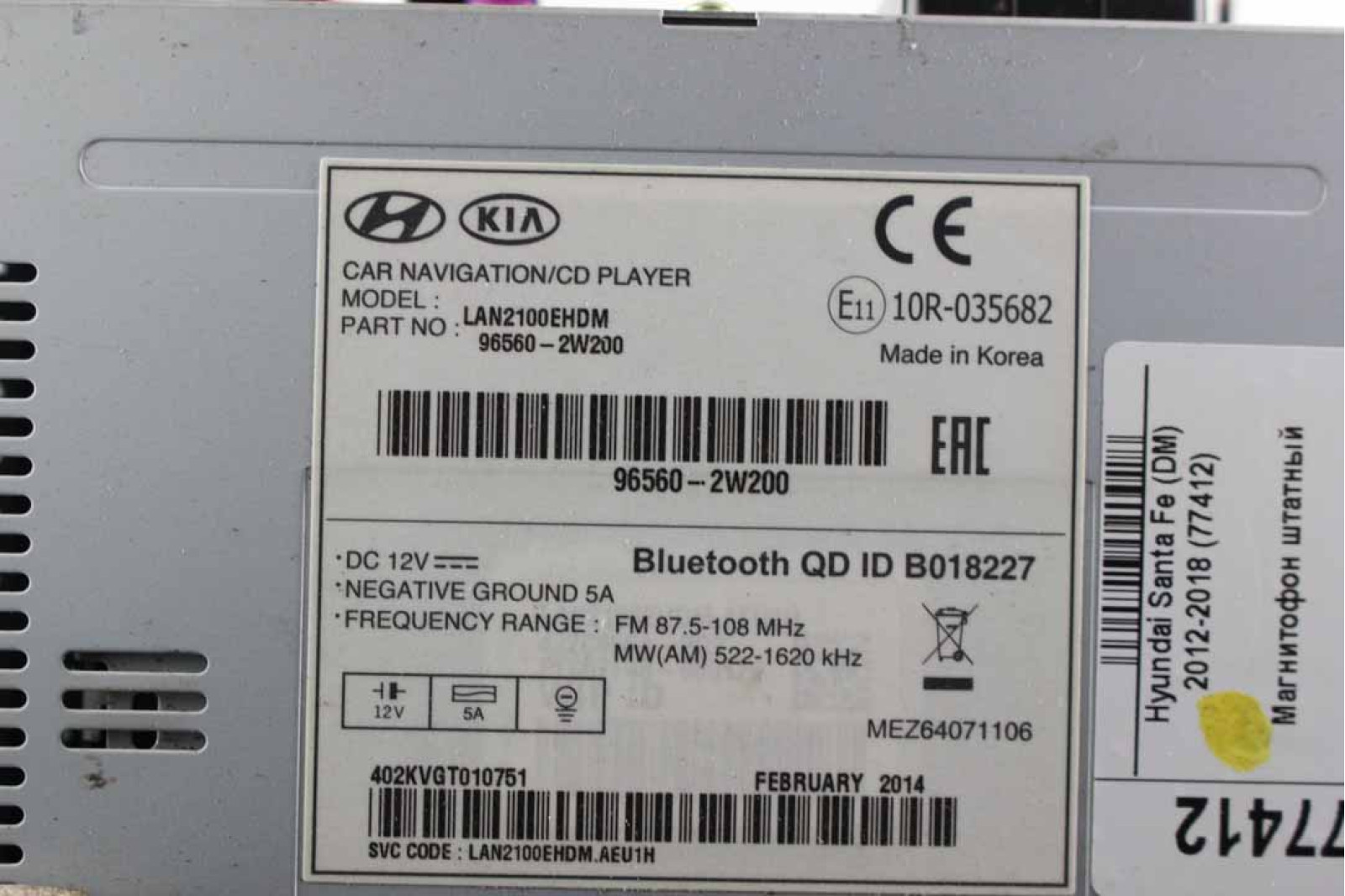 Магнитофон Hyundai Santa Fe (DM) 2012-2018 (965602W200) в хорошем рабочем состоянии. Покупая запчасти с нашей разборки машин марки HYUNDAI Вы экономите свои деньги, нервы и время.